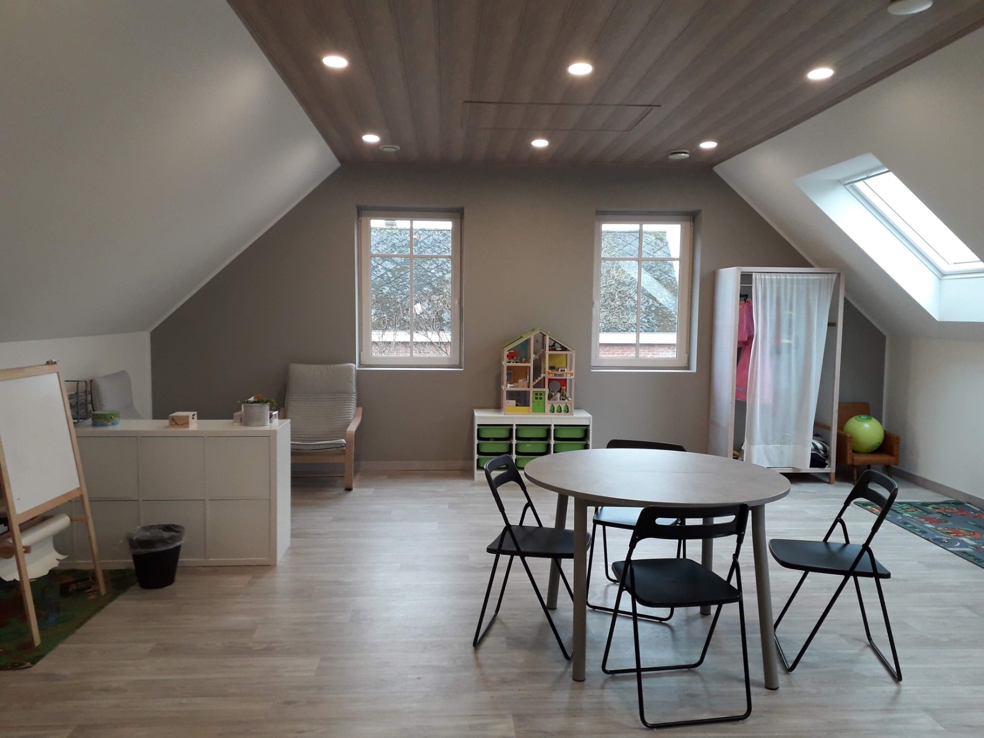 We bieden zowel op het gelijkvloers als boven een grote ruimte die gedeeld wordt met één van onze spelcounselors. Deze is deels ingericht als spelkamer maar is voldoende groot om nog een aparte gesprekshoek te voorzien.